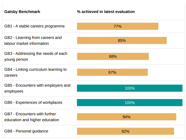 Our careers provision measures it’s impact and outcomes by meeting the Gatsby Benchmarks set out by the Department for Education along with destinations.